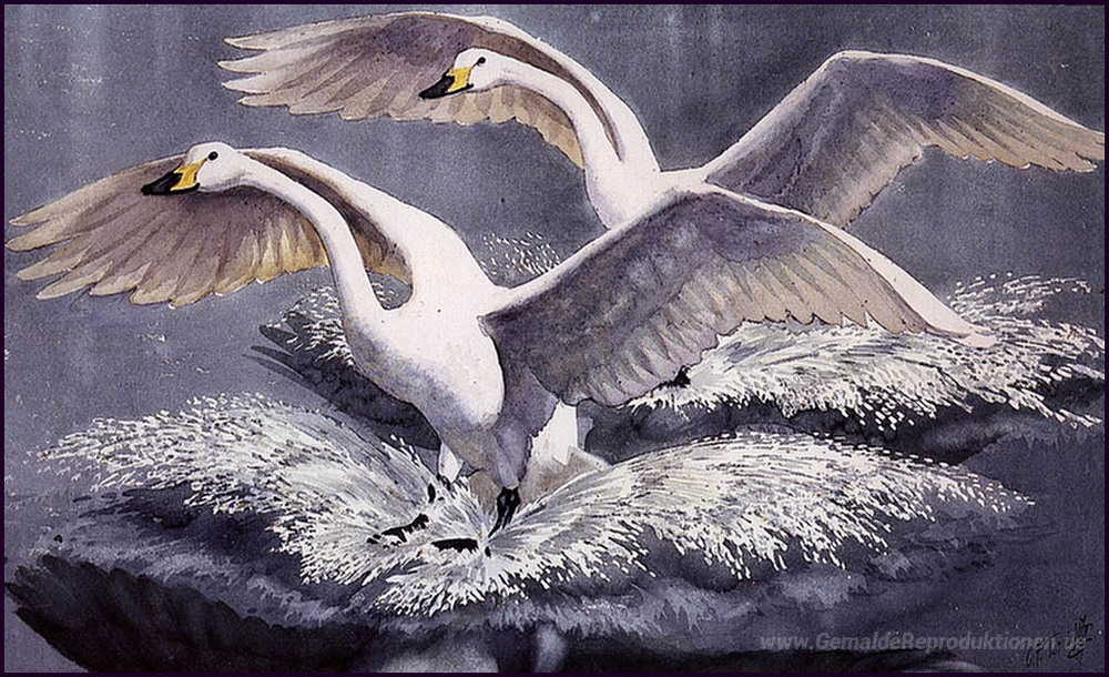 Wir bieten Ihnen eine handgefertigte Reproduktion auf Leinwand des berühmten Kunstwerks 'Whoopers Aufsetzen' von Charles Tunnicliffe, aus dem Reproduktionsmuseum.