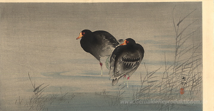Wir bieten Ihnen eine handgefertigte Reproduktion auf Leinwand des berühmten Kunstwerks 'Zwei Teichhühner im flachen Wasser' von Ohara Koson, aus dem Reproduktionsmuseum.