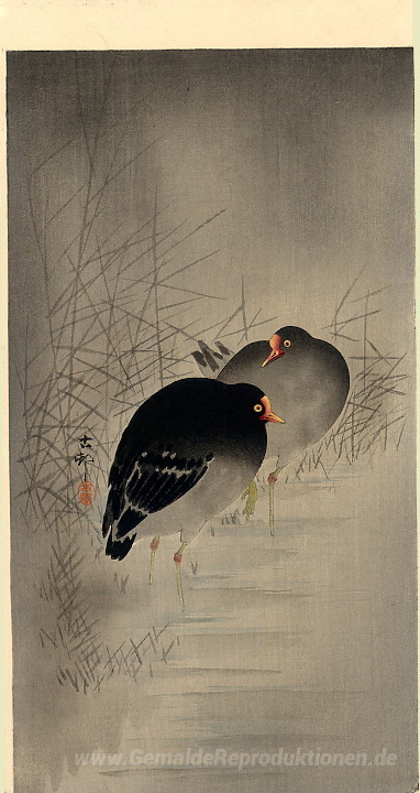 Wir bieten Ihnen eine handgefertigte Reproduktion auf Leinwand des berühmten Kunstwerks 'Zwei Teichhühner' von Ohara Koson, aus dem Reproduktionsmuseum.