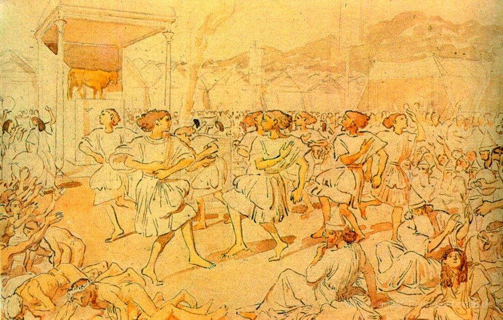 Wir bieten Ihnen eine handgefertigte Reproduktion auf Leinwand des berühmten Kunstwerks 'Adorarion des Goldenen Kalbes' von Alexander Ivanov, aus dem Reproduktionsmuseum.