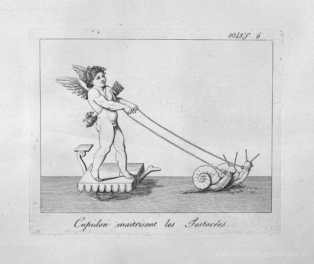 Wir bieten Ihnen eine handgefertigte Reproduktion auf Leinwand des berühmten Kunstwerks 'Amor und Schnecken' von Giovanni Battista Piranesi, aus dem Reproduktionsmuseum.