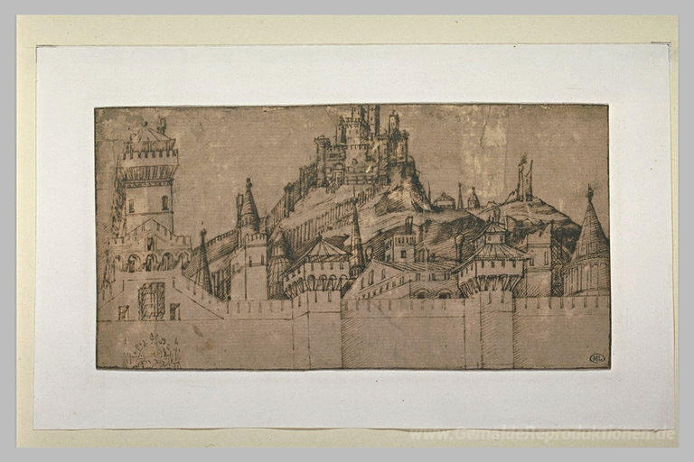 Wir bieten Ihnen eine handgefertigte Reproduktion auf Leinwand des berühmten Kunstwerks 'Ansicht einer Festung von Jerusalem' von Jacopo Bellini, aus dem Reproduktionsmuseum.