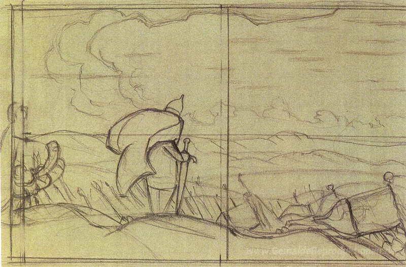Wir bieten Ihnen eine handgefertigte Reproduktion auf Leinwand des berühmten Kunstwerks 'Arrows of sky - Speere Land' von Nicholas Roerich, aus dem Reproduktionsmuseum.