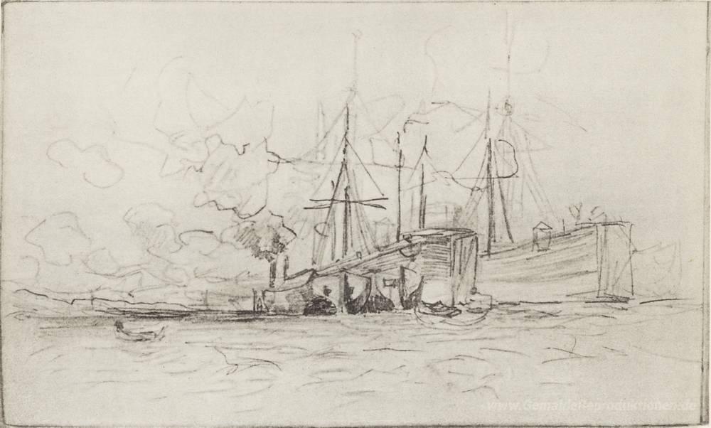 Wir bieten Ihnen eine handgefertigte Reproduktion auf Leinwand des berühmten Kunstwerks 'Barges' von Isaac Levitan, aus dem Reproduktionsmuseum.
