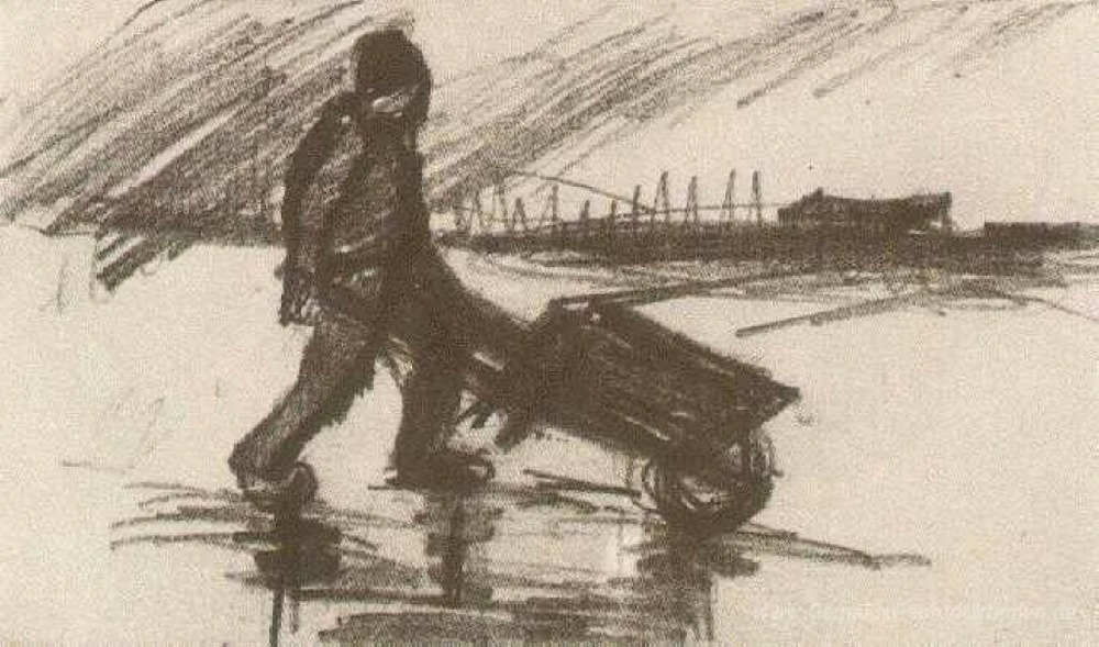 Wir bieten Ihnen eine handgefertigte Reproduktion auf Leinwand des berühmten Kunstwerks 'Bauer, Gehen mit einer Schubkarre' von Vincent van Gogh, aus dem Reproduktionsmuseum.