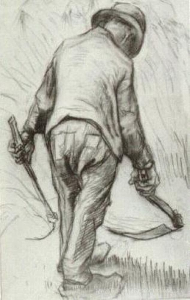 Wir bieten Ihnen eine handgefertigte Reproduktion auf Leinwand des berühmten Kunstwerks 'Bauer mit Sichel, gesehen von der Rückseite' von Vincent van Gogh, aus dem Reproduktionsmuseum.