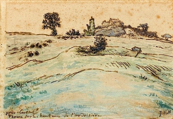 Wir bieten Ihnen eine handgefertigte Reproduktion auf Leinwand des berühmten Kunstwerks 'Bauernhof auf den Hügeln in der Nähe des Ardoisière Cusset' von Jean-Francois Millet, aus dem Reproduktionsmuseum.