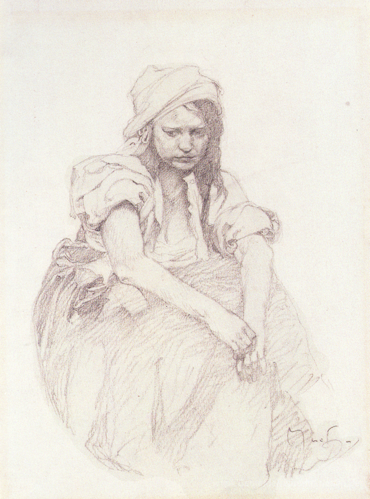 Wir bieten Ihnen eine handgefertigte Reproduktion auf Leinwand des berühmten Kunstwerks 'Betrachtung' von Alphonse Mucha, aus dem Reproduktionsmuseum.