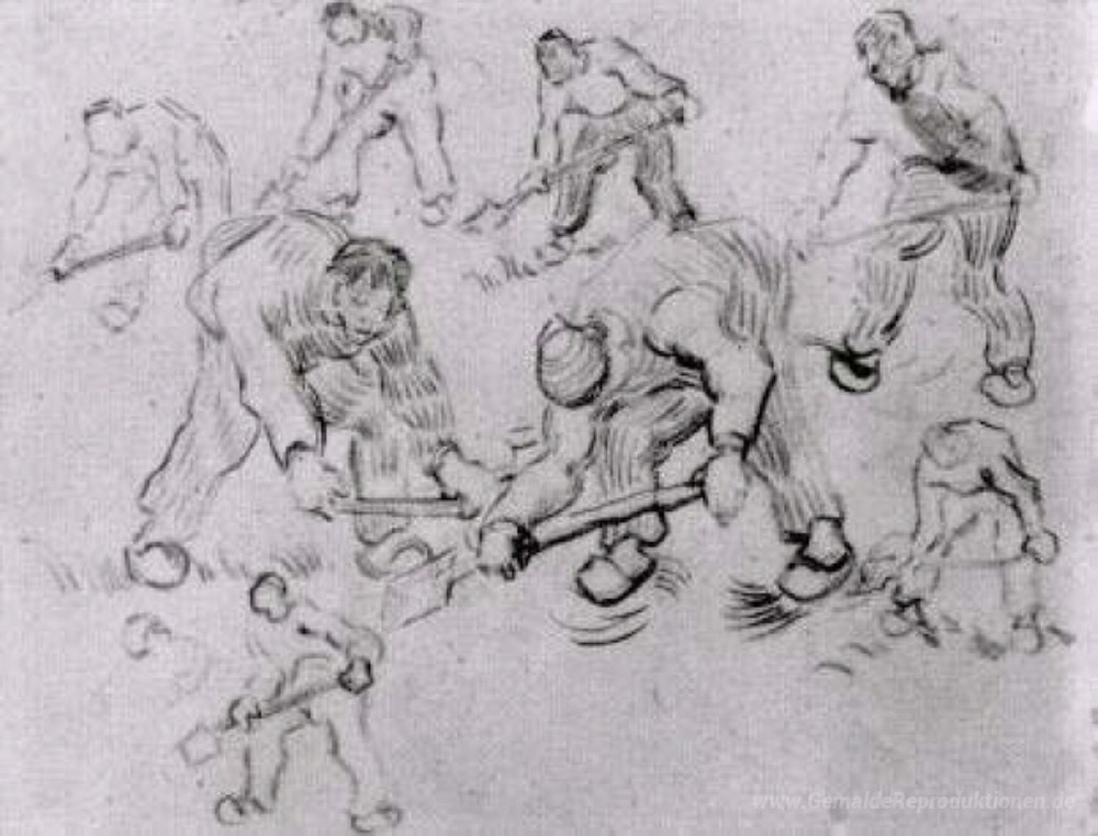 Wir bieten Ihnen eine handgefertigte Reproduktion auf Leinwand des berühmten Kunstwerks 'Blatt mit Skizzen von Diggers und andere Figuren' von Vincent van Gogh, aus dem Reproduktionsmuseum.