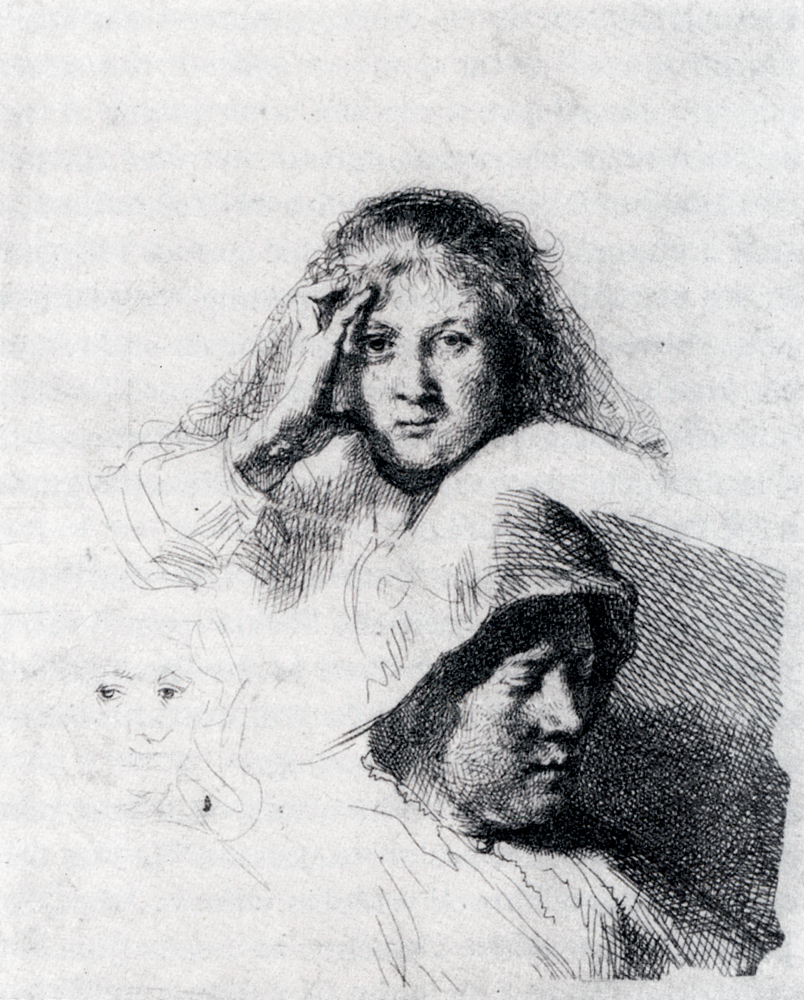Wir bieten Ihnen eine handgefertigte Reproduktion auf Leinwand des berühmten Kunstwerks 'Blatt Sketches mit einem Porträt von Saskia' von Rembrandt, aus dem Reproduktionsmuseum.