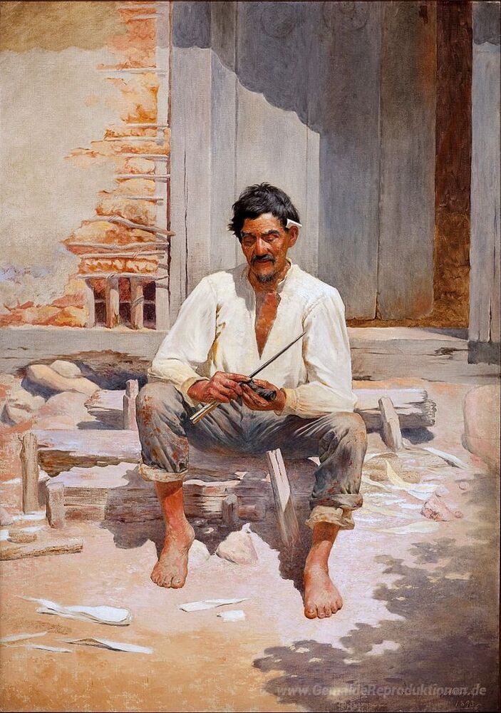 Willkommen in der faszinierenden Welt der Ölgemälde, in der jeder Pinselstrich eine Geschichte erzählt und Emotionen weckt. Unser ausgewähltes Kunstwerk, Caipira Chopping Tobacco (Skizze), stammt von dem renommierten brasilianischen Künstler Jose Ferraz de Almeida Junior, der für seine meisterhafte Fähigkeit bekannt ist, das alltägliche Leben in ansprechende visuelle Erzählungen zu verwandeln. Seine Werke zeichnen sich durch lebendige Farben und einen einzigartigen Realismus aus, der die Betrachter in eine andere Zeit und einen anderen Ort entführt.