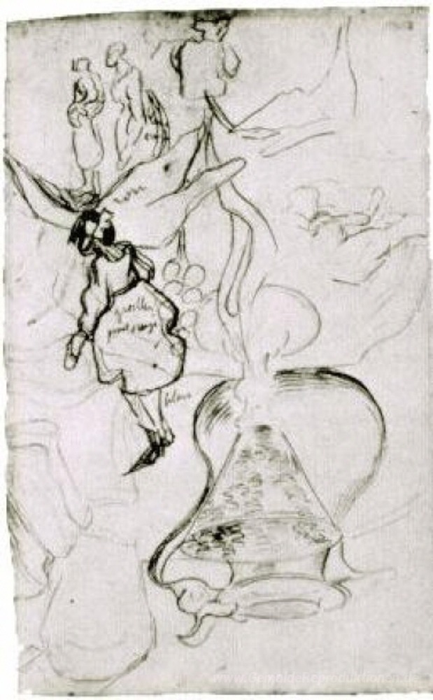 Wir bieten Ihnen eine handgefertigte Reproduktion auf Leinwand des berühmten Kunstwerks 'Can, Bücher, Weinglas, Brot und Arum Skizze von zwei Frauen und ' von Vincent van Gogh, aus dem Reproduktionsmuseum.