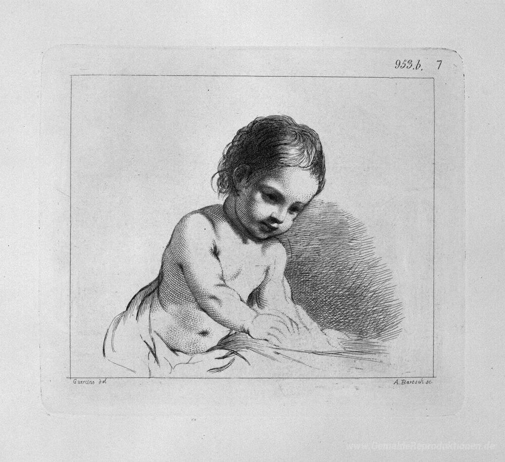 Wir bieten Ihnen eine handgefertigte Reproduktion auf Leinwand des berühmten Kunstwerks 'Cherub, halbe Länge, von Guercino' von Giovanni Battista Piranesi, aus dem Reproduktionsmuseum.