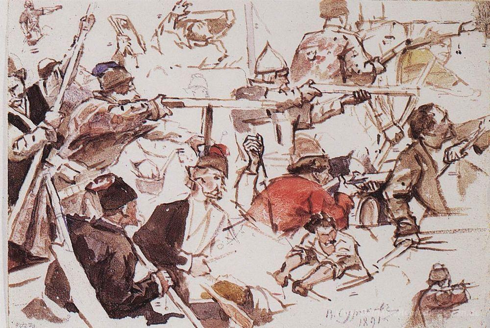 Wir bieten Ihnen eine handgefertigte Reproduktion auf Leinwand des berühmten Kunstwerks 'Cossacks' von Vasily Surikov, aus dem Reproduktionsmuseum.