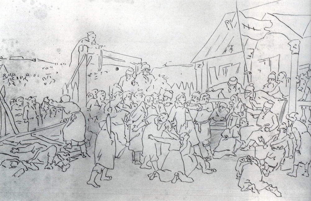 Wir bieten Ihnen eine handgefertigte Reproduktion auf Leinwand des berühmten Kunstwerks 'Court Pugacheva' von Vasily Perov, aus dem Reproduktionsmuseum.