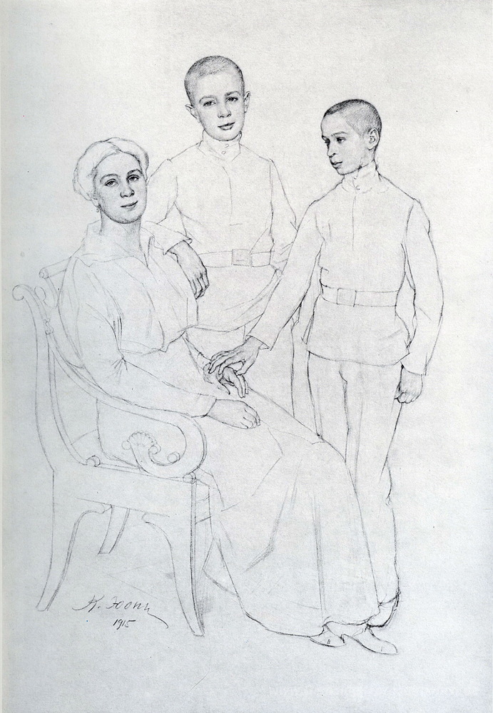Wir bieten Ihnen eine handgefertigte Reproduktion auf Leinwand des berühmten Kunstwerks 'Das Familien-Porträt (Klavdiya Yuon, Ehefrau Künstlers und Söhne' von Konstantin Yuon, aus dem Reproduktionsmuseum.
