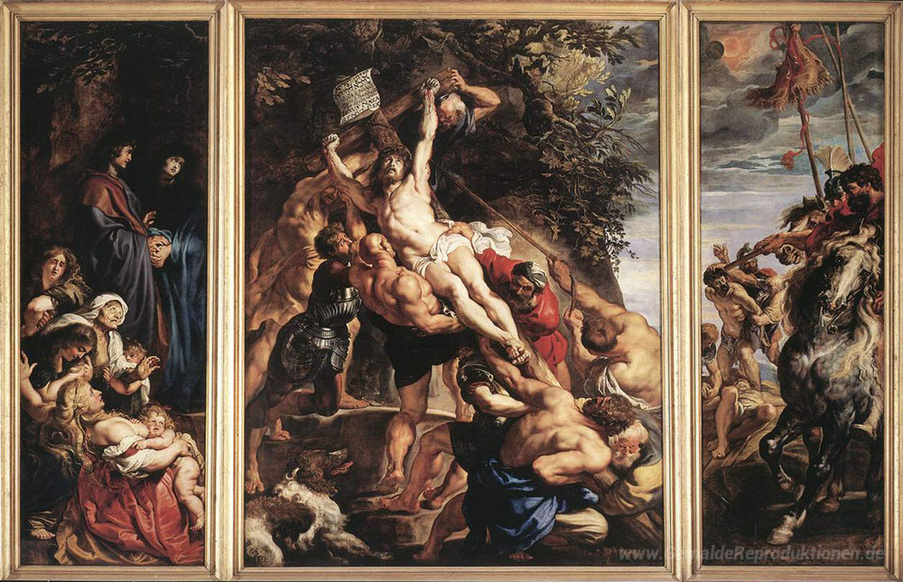 Wir bieten Ihnen eine handgefertigte Reproduktion auf Leinwand des berühmten Kunstwerks 'Der Aufzug des Kreuzes' von Peter Paul Rubens, aus dem Reproduktionsmuseum.