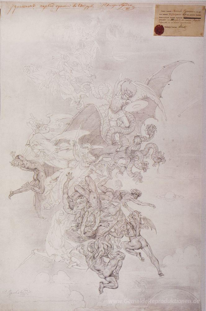 Wir bieten Ihnen eine handgefertigte Reproduktion auf Leinwand des berühmten Kunstwerks 'Der Kampf der guten Geister gegen böse Geister' von Vasily Surikov, aus dem Reproduktionsmuseum.