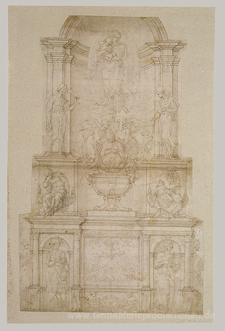Wir bieten Ihnen eine handgefertigte Reproduktion auf Leinwand des berühmten Kunstwerks 'Design für Julius II Grab (erste Version)' von Michelangelo, aus dem Reproduktionsmuseum.