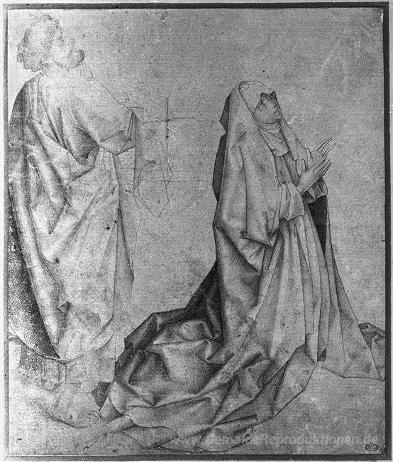Wir bieten Ihnen eine handgefertigte Reproduktion auf Leinwand des berühmten Kunstwerks 'Die Jungfrau betet kniend hinter St. Peter' von Rogier van der Weyden, aus dem Reproduktionsmuseum.