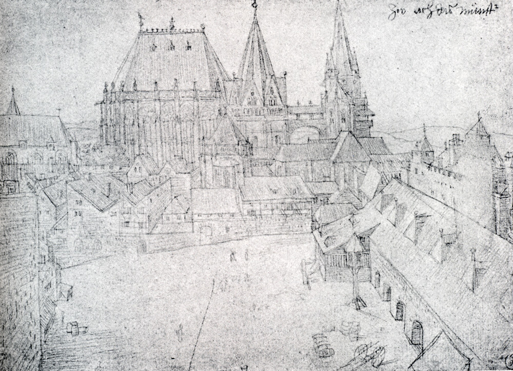 Wir bieten Ihnen eine handgefertigte Reproduktion auf Leinwand des berühmten Kunstwerks 'Die Kathedrale von Aachen mit seiner Umgebung, gesehen vom Krönu' von Albrecht Durer, aus dem Reproduktionsmuseum.