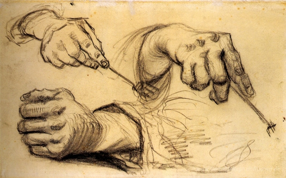 Wir bieten Ihnen eine handgefertigte Reproduktion auf Leinwand des berühmten Kunstwerks 'Drei Hände, zwei Halte Forks' von Vincent van Gogh, aus dem Reproduktionsmuseum.