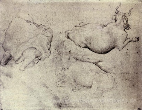 Wir bieten Ihnen eine handgefertigte Reproduktion auf Leinwand des berühmten Kunstwerks 'Drei Kühe' von Pisanello, aus dem Reproduktionsmuseum.