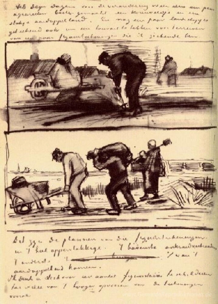 Wir bieten Ihnen eine handgefertigte Reproduktion auf Leinwand des berühmten Kunstwerks 'Drei Personen Rückkehr aus dem Kartoffelfeld' von Vincent van Gogh, aus dem Reproduktionsmuseum.