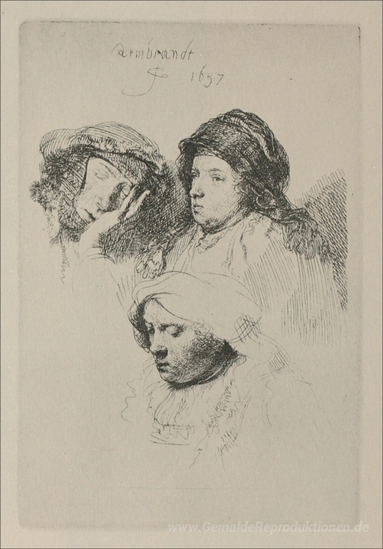 Wir bieten Ihnen eine handgefertigte Reproduktion auf Leinwand des berühmten Kunstwerks 'Drei weibliche Köpfe mit einem Schlaf' von Rembrandt, aus dem Reproduktionsmuseum.