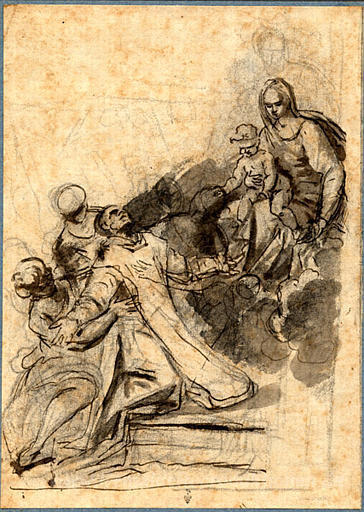 Wir bieten Ihnen eine handgefertigte Reproduktion auf Leinwand des berühmten Kunstwerks 'Ein Heiliger kniend und von Engeln unterstützt, in Ekstase vor d' von Bartolome Esteban Murillo, aus dem Reproduktionsmuseum.