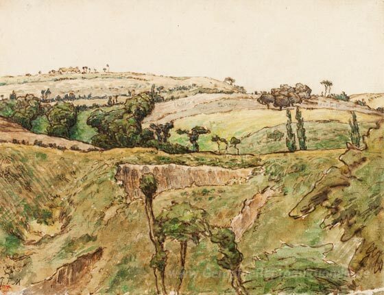 Wir bieten Ihnen eine handgefertigte Reproduktion auf Leinwand des berühmten Kunstwerks 'Eine hügelige Landschaft' von Jean-Francois Millet, aus dem Reproduktionsmuseum.