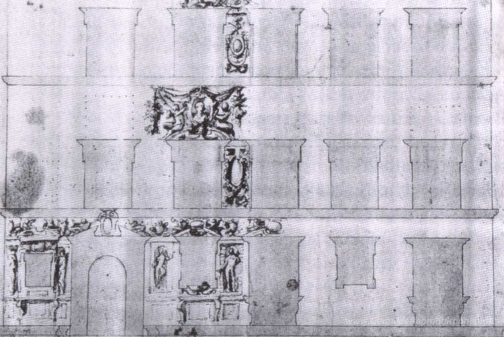 Wir bieten Ihnen eine handgefertigte Reproduktion auf Leinwand des berühmten Kunstwerks 'Entwurf für die Fassade des Palazzo Ramirez de Montalvo' von Giorgio Vasari, aus dem Reproduktionsmuseum.