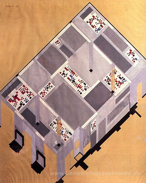 Wir bieten Ihnen eine handgefertigte Reproduktion auf Leinwand des berühmten Kunstwerks 'Entwurf für die Teestube im Erdgeschoss des Cafe Aubette' von Sophie Taeuber-Arp, aus dem Reproduktionsmuseum.