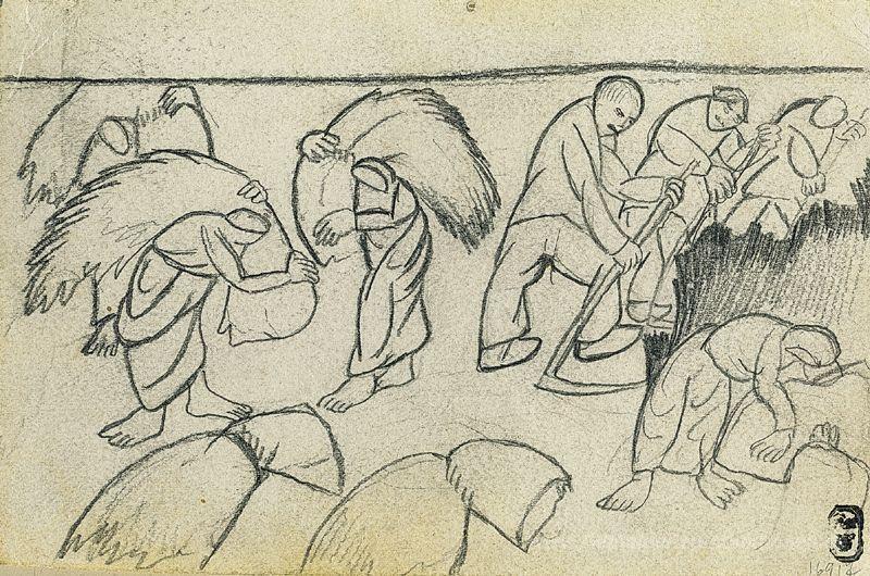 Wir bieten Ihnen eine handgefertigte Reproduktion auf Leinwand des berühmten Kunstwerks 'Ernten' von Kazimir Malevich, aus dem Reproduktionsmuseum.