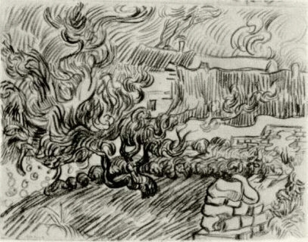 Wir bieten Ihnen eine handgefertigte Reproduktion auf Leinwand des berühmten Kunstwerks 'Häuser zwischen Bäumen' von Vincent van Gogh, aus dem Reproduktionsmuseum.