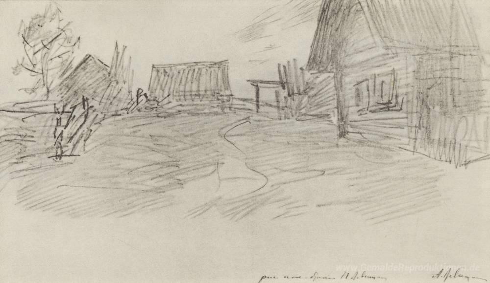 Wir bieten Ihnen eine handgefertigte Reproduktion auf Leinwand des berühmten Kunstwerks 'Hütten' von Isaac Levitan, aus dem Reproduktionsmuseum.