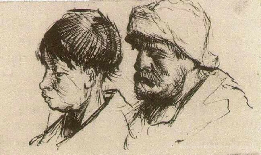 Wir bieten Ihnen eine handgefertigte Reproduktion auf Leinwand des berühmten Kunstwerks 'Head of a Girl, barhäuptig und Kopf eines Mannes mit Bart und Mü' von Vincent van Gogh, aus dem Reproduktionsmuseum.
