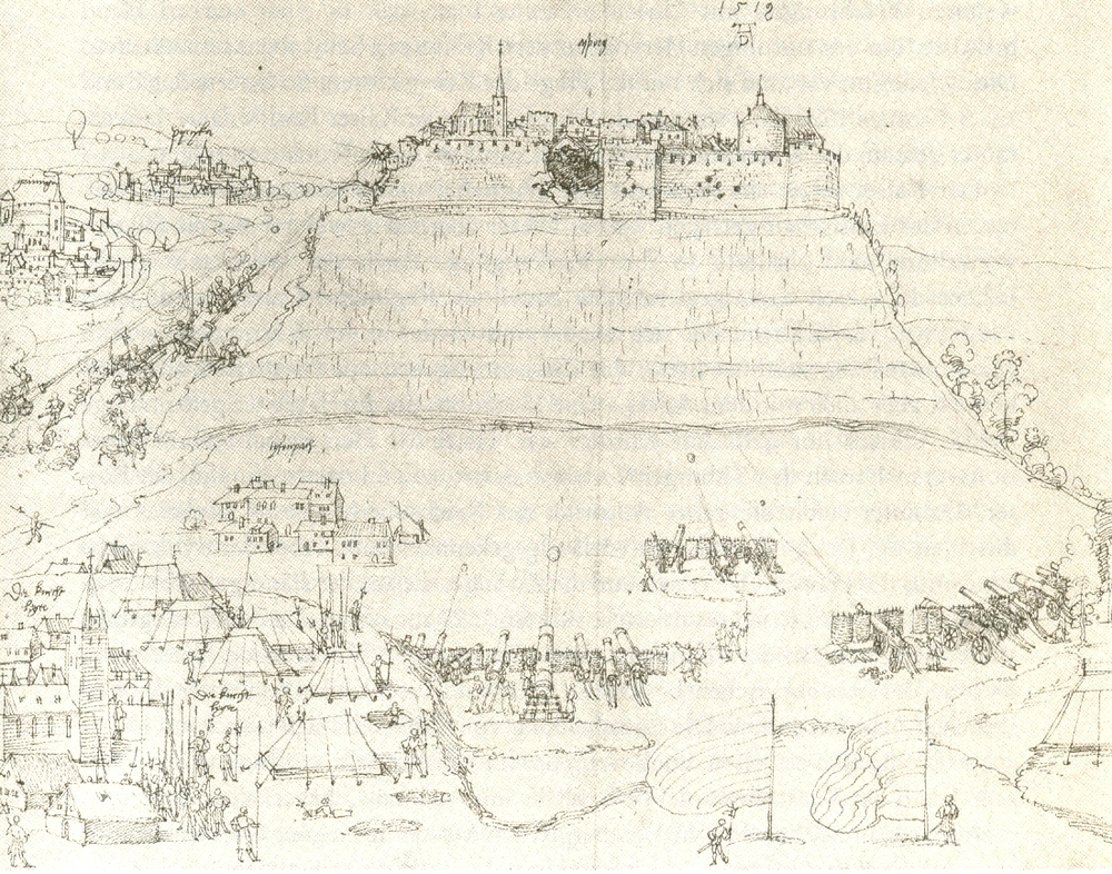 Wir bieten Ihnen eine handgefertigte Reproduktion auf Leinwand des berühmten Kunstwerks 'Hohenasperg Belagerung von Georg von Frundsberg im Krieg der Sch' von Albrecht Durer, aus dem Reproduktionsmuseum.