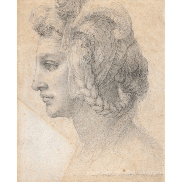 Wir bieten Ihnen eine handgefertigte Reproduktion auf Leinwand des berühmten Kunstwerks 'Ideal Kopf einer Frau' von Michelangelo, aus dem Reproduktionsmuseum.