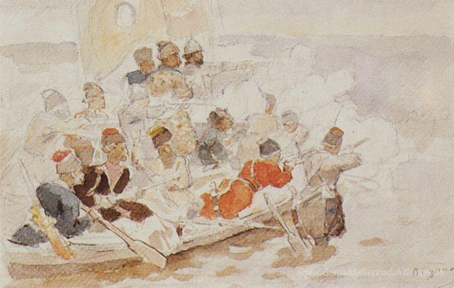 Wir bieten Ihnen eine handgefertigte Reproduktion auf Leinwand des berühmten Kunstwerks 'Jermaks Eroberung Sibiriens (Studie)' von Vasily Surikov, aus dem Reproduktionsmuseum.