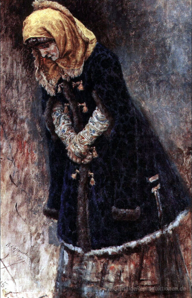 Wir bieten Ihnen eine handgefertigte Reproduktion auf Leinwand des berühmten Kunstwerks 'Junge Dame mit blauen Pelzmantel' von Vasily Surikov, aus dem Reproduktionsmuseum.