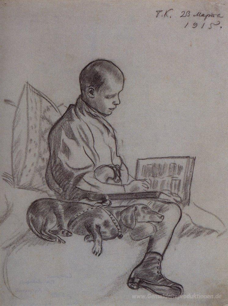Wir bieten Ihnen eine handgefertigte Reproduktion auf Leinwand des berühmten Kunstwerks 'Junge mit Hund (Porträt von Cyril Kustodiev, Sohn des Künstlers)' von Boris Kustodiev, aus dem Reproduktionsmuseum.