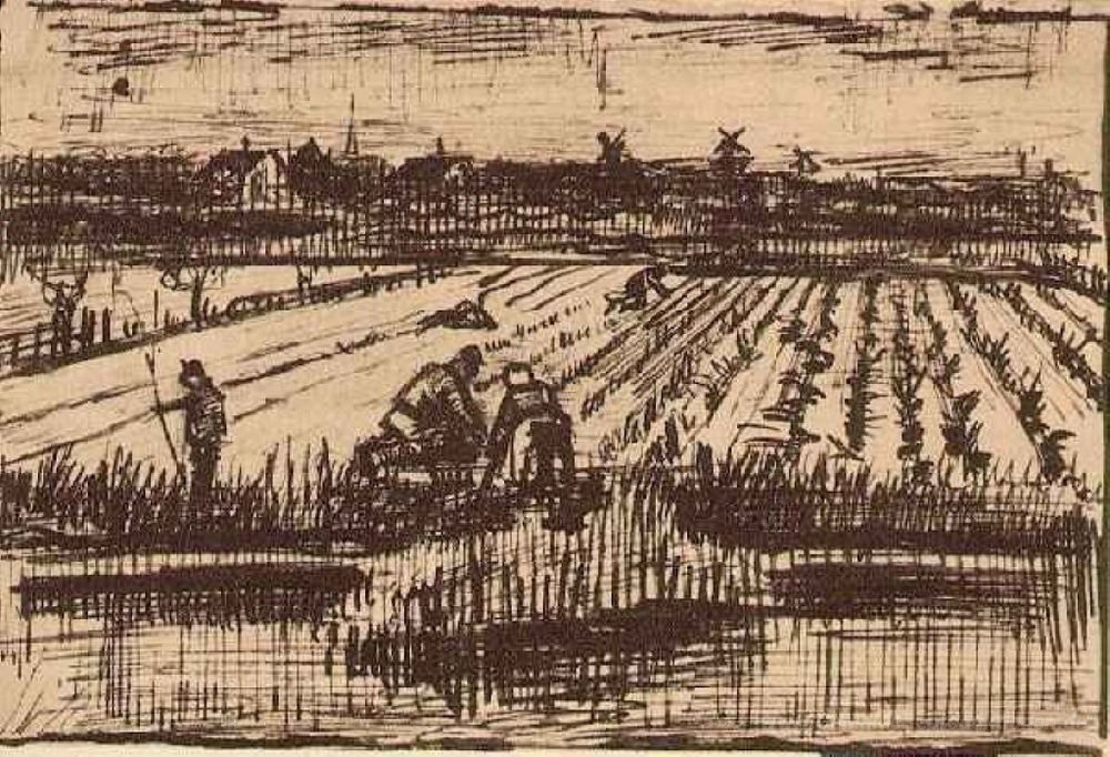 Wir bieten Ihnen eine handgefertigte Reproduktion auf Leinwand des berühmten Kunstwerks 'Kartoffel-Feld' von Vincent van Gogh, aus dem Reproduktionsmuseum.