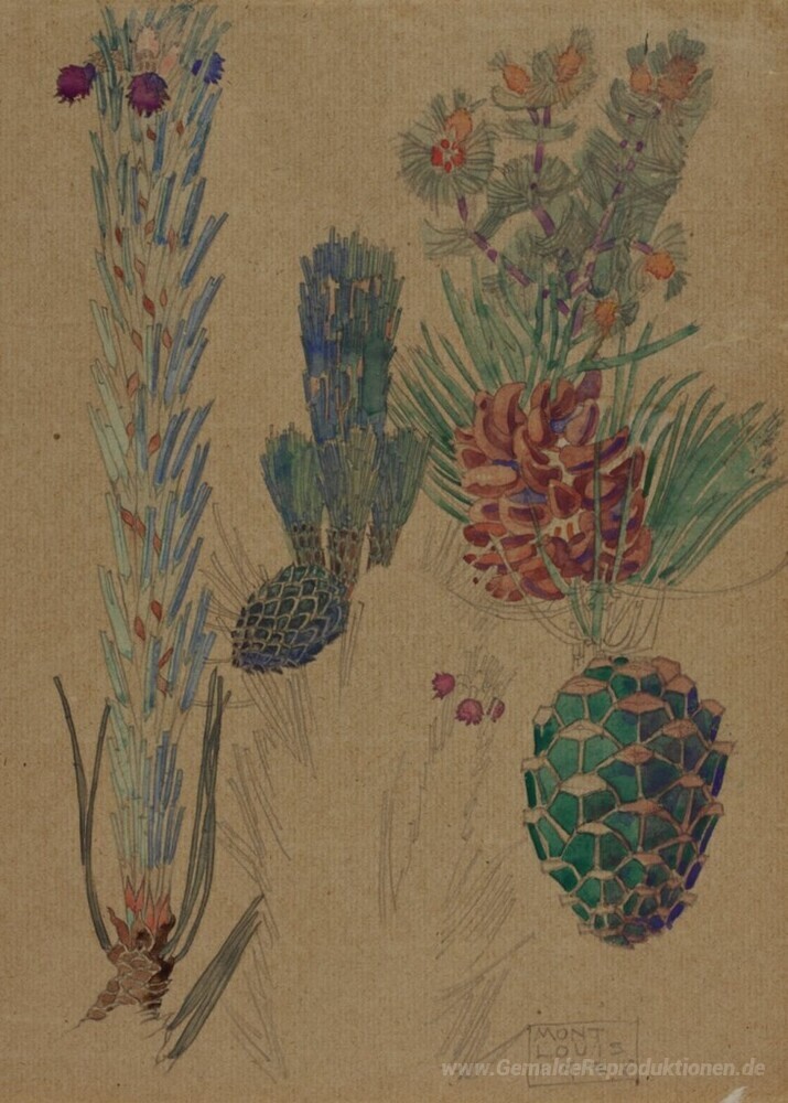Wir bieten Ihnen eine handgefertigte Reproduktion auf Leinwand des berühmten Kunstwerks 'Kiefernzapfen' von Charles Rennie Mackintosh, aus dem Reproduktionsmuseum.