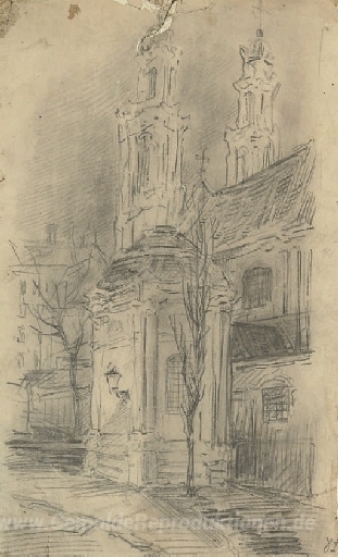 Wir bieten Ihnen eine handgefertigte Reproduktion auf Leinwand des berühmten Kunstwerks 'Kirche in Vilnius' von Mstislav Dobuzhinsky, aus dem Reproduktionsmuseum.