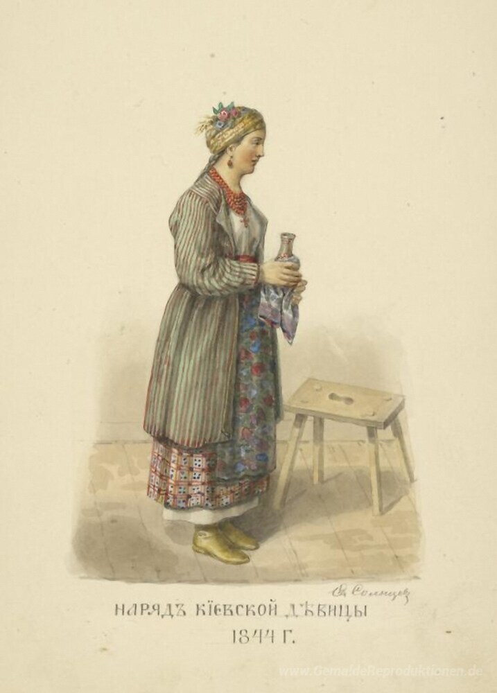 Wir bieten Ihnen eine handgefertigte Reproduktion auf Leinwand des berühmten Kunstwerks 'Kleid der Kiew Mädchen' von Fyodor Solntsev, aus dem Reproduktionsmuseum.