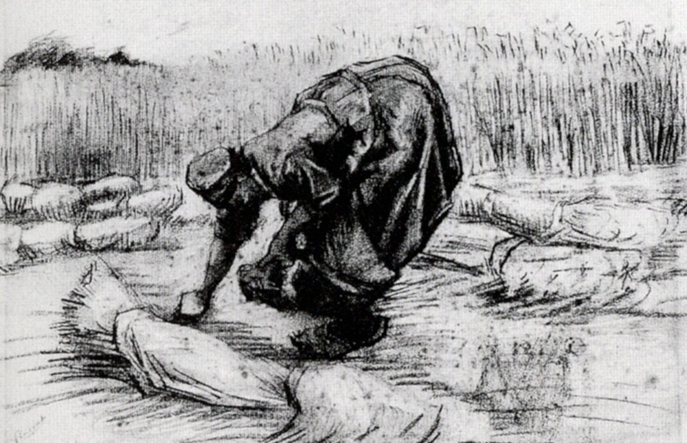 Wir bieten Ihnen eine handgefertigte Reproduktion auf Leinwand des berühmten Kunstwerks 'Ländliche Frau, Bücken zwischen Garben' von Vincent van Gogh, aus dem Reproduktionsmuseum.