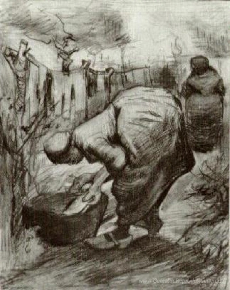 Wir bieten Ihnen eine handgefertigte Reproduktion auf Leinwand des berühmten Kunstwerks 'Ländliche Frau im Waschtrog und Bäuerin Aufhängen der Wäsche' von Vincent van Gogh, aus dem Reproduktionsmuseum.