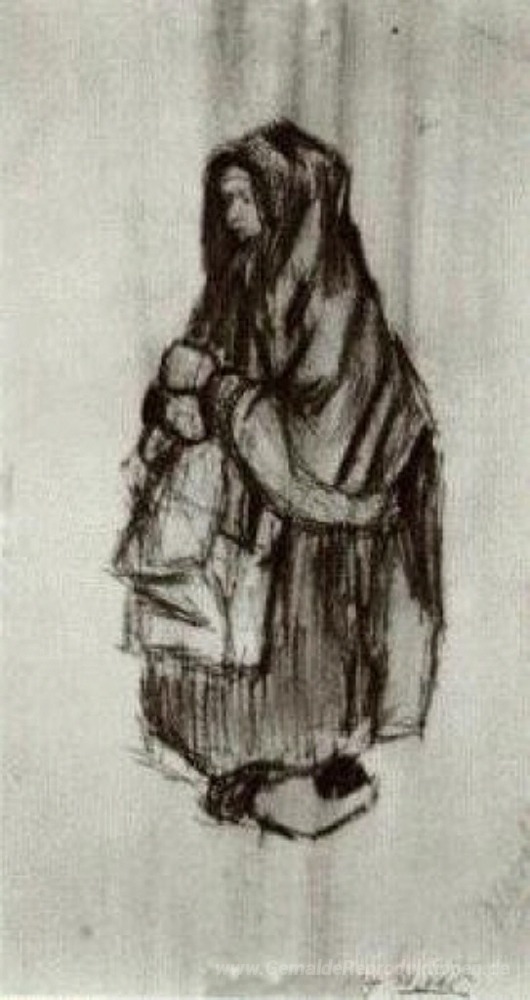 Wir bieten Ihnen eine handgefertigte Reproduktion auf Leinwand des berühmten Kunstwerks 'Ländliche Frau mit Schal über den Kopf von der Seite 2 gesehen' von Vincent van Gogh, aus dem Reproduktionsmuseum.