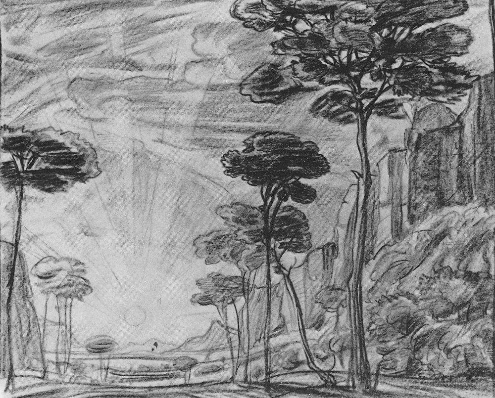Wir bieten Ihnen eine handgefertigte Reproduktion auf Leinwand des berühmten Kunstwerks 'Landschaft mit hohen Bäumen' von Konstantin Bogaevsky, aus dem Reproduktionsmuseum.